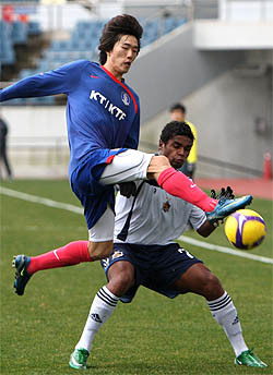 축구 국가대표팀 김정우가 21일 낮 제주월드컵경기장에서 벌어진 울산현대와의 연습경기에서 공을 가로채고 있다. (desk@jjan.kr)