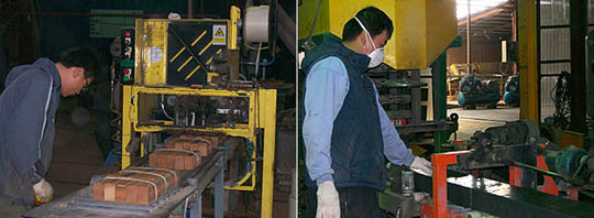 대평세라믹스산업이 무연탄 석탄회를 원료로 생산한 외장재 벽돌이 밴딩기를 통과하며 다섯개씩 묶음포장되고 있다(좌). 대평세라믹스산업의 작업장 모습. (desk@jjan.kr)