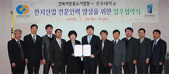 전북지방중소기업청과 전주대는 지난달 29일 전북중기청 중회의실에서 양 기관 관계자 20여명이 참석한 가운데 '한지산업 전문인력 양성을 위한 업무협약'을 체결했다.