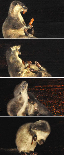 #첫 상견례와 짝짓기 = 기자는 소식을 듣고 그날 오후 6시 600mm 망원렌즈와 야간촬영에 필요한 장비를 챙겨 '수달 찾기'에 나섰다. 이틀간에 걸친 잠복 끝에 한밤중 수달을 카메라에 담아 보도했지만(본보 3월 24일자) 사진 상태가 좋지 않아 아쉬움이 컸었다. 그런 뒤 기자는 10 여 차례의 취재 끝에 짝짓기 하는 한 쌍의 수달을 촬영해 그 해 4월 14일자 신문에 보도했다.