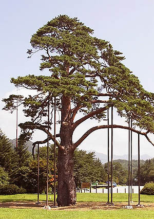 조선조 7대 임금인 세조(1455년∼1468년) 행차시 어가(御駕)행렬이 무사히 통과토록 가지를 스스로 들어 올려 정이품 벼슬을 받았다고 전해지는 이 나무(높이 16m, 가슴높이 둘레 4.7m)는 1980년대 솔잎혹파리에 감염돼 투병했으며 1993년 이후 4차례 강풍과 폭설 피해를 봐 4개의 큰 가지 중 3개를 잃었다.