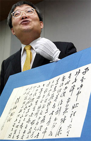 성균관대 동아시아학술원과 한국고전번역원 번역대학원은 9일 오전 성균관대 600주년 기념관에서 기자회견을 갖고 정조가 예조판서와 우의정 등을 역임한 노론 벽파(僻派)의 거두 심환지(沈煥之.1730-1802)에게 보낸 어찰첩(御札帖)을 발굴했다고 발표했다.