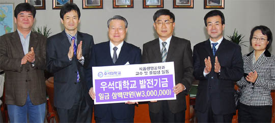 우석대 식품생명공학과(학과장 오찬호) 교수와 동문들이 대학발전을 위해 써 달라며 발전기금 300만원을 기탁했다.