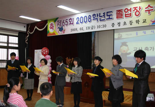 지난 13일 치러진 김제 종정초등학교(교장 백동규) 제 65회 졸업식이 여느때와 달리 졸업생, 재학생, 교사가 함께 연출돼 화제가 됐다.