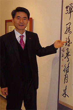이번 전시에서 그가 애착을 갖는 작품은 '서익 선생의 사시조'. 자신의 제14대 선조였던 서익 선생 서체를 담기 위해 봄·여름·가을·겨울의 시를 머릿속에서 되뇌이고 다녔다고. 때마침 중국 '한·중 작가 초대전'에 갔다가 한 골동품시장에서 당(唐)대 시인 왕발의 등왕각 서문에 쓰여졌던 각(도장)을 발견할 수 있었다. 강물과 하늘의 색이 맞닿은 정취를 담은 각으로 작품의 완성도를 높일 수 있었던 것.