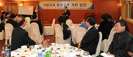 전·현직 자치단체장과 자치단체장의 모임인 '머슴골'(회장 임수진·전 한국농촌공사 사장)이 지난 20일 고창 선운산관광호텔에서 주최한 '지방자치 행정구역 개편방안'세미나에서 참가자들은 주민을 위한 행정체제 개편인 만큼 주민들의 의견 결집과 공론화가 우선이라는데 입을 모았다. 이날 세미나는 행정체제 개편을 둘러싼 각 지자체의 목소리를 대변할 수 있는 전·현직 시장·군수와 구청장, 국회의원, 전직 행자부장관 등 40여명이 대거 참석해 의미를 더했다.