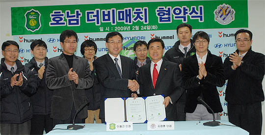 전북현대모터스축구단(단장 이철근)과 전남드래곤즈(단장 김영훈)가 24일 전주월드컵경기장 2층 브리핑실에서 올해 처음으로 도입되는'호남 더비매치'협약식을 가졌다.