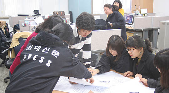 3학년 3명, 2학년 4명 등 7명의 학생기자와 객원기자 3명 등 10명으로 구성된 원광대신문사는 신문마감을 위해 매주 이같은 전쟁을 벌이고 있다.