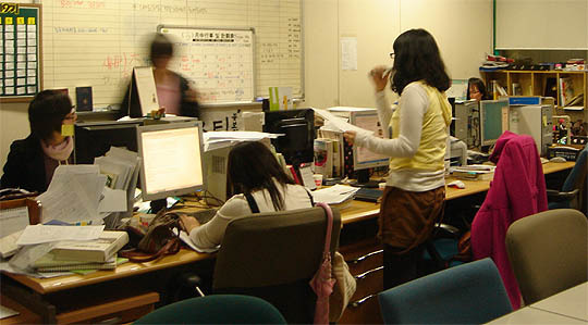 "늦어도 9시까지는 마감을 해야하기 때문에 이 시간이면 다들 가장 예민해요. 교정도 봐야하고 기사 취합해서 편집 레이아웃도 짜야하니까 시간이 촉박하거든요. 이러다 보면 으레 밤샘 작업으로 이어져요."