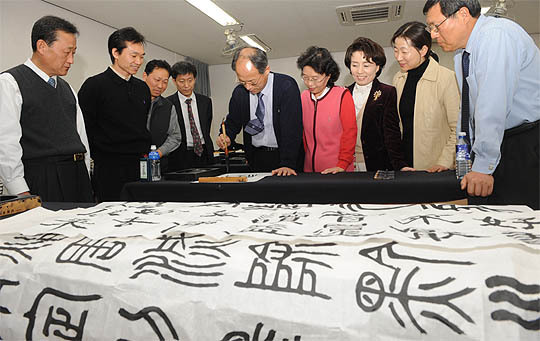 능숙한 솜씨로 곧추 세워 잡은 붓을 놀리는 중년 남녀의 얼굴에는 진지함이 묻어났다. 평소 같으면 강단에 서 있을 교수들, 그러나 이날만은 동년배 교수의 가르침을 겸허한 자세로 받아들였다.