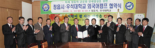 정읍시(시장 강광)와 우석대학교(총장 라종일)는 23일 시청 2층 영상회의실에서 2009년도 외국어캠프 운영에 대한 협약식을 가졌다.