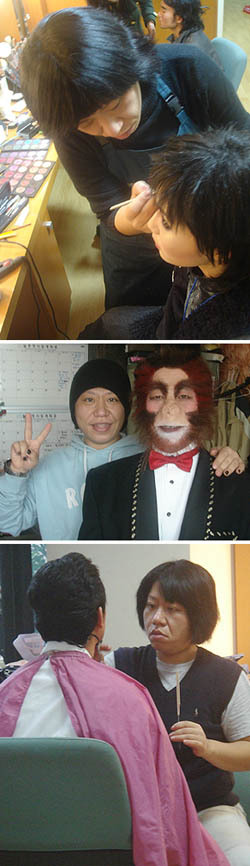 연극 '빨간 피터의 고백'의 주인공 김준씨의 경우 땀이 유독 많았다고. 원숭이 분장을 위해 붙인 털을 떼어냈다 붙였단 하는 과정은 그야말로 고역. 지방 순회 공연의 경우 미리 본을 떠서 사용하기도 했지만, 배우들의 특성에 따라 그가 함께 해야 하는 순간도 있다.