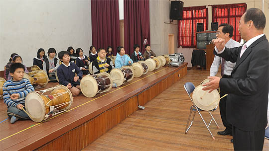 순창 금과초등학교 학생들이 일본 미나미큐슈시 청소년 홈스테이단 앞에서 풍물공연을 보여주고 있다. (desk@jjan.kr)