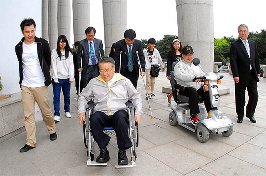 이날 참석자들은 휠체어와 목발·지팡이 등을 사용, 시각장애 및 지체장애를 체험했다. 또 교내 장애학생지원센터에 들러 학습보조 기자재인 점자프린터와 검색용 컴퓨터·언어장애 의사소통기기 등을 살펴보았다.