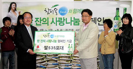 이 캠페인을 통해 진로는 올 3월부터 5월까지 판매되는 참이슬 수익금을 조성, 이 기금으로 구입한 쌀을 사회복지공동 모금회(사랑의 열매)를 통해 노인 복지관등 독거노인가정, 조손가정 및 결식아동가정 등 지원이 필요한 전북지역의 저소득층 가정과 지역아동센터 등 사회복지시설 저소득층에 기부할 방침이다.