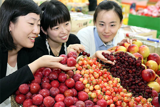 (주)농협유통은 23일 농협 하나로클럽 양재점 과일매장에서 올해 첫 출하된 버찌와 천도복숭아 등 붉은 과실류를 선보였다.