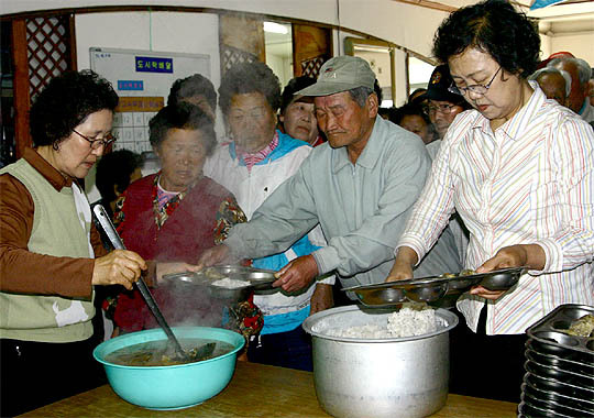도시락 다음은 이 식당에서 끼니를 해결하는 노인들을 위한 점심상. 국과 반찬 만들기가 마무리될 즈음인 10시 30분께부터 할머니 할아버지들의 발걸음이 이어진다. 배식시간이 1시간은 족히 남았는데도 삼삼오오 모여든 이들은 식탁에 둘러앉아 이야기 꽃을 피운다.