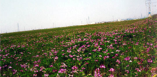 밝은 자색빛의 화려하고 아기자기한 자운영 꽃은 멀리 보면 아련한 이미지를 주는 대표적 꽃으로, 주로 물을 뺀 저지대 논이나 길가에 자라는 식물로, 토끼풀과 유사하며 4월 말에서 5월 사이에 만개한다.