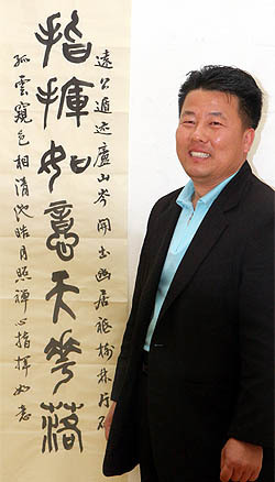 '제41회 전북미술대전' 종합대상을 수상한 서예 부문의 김재홍씨(48·전주시 인후동). 다소 얼떨떨한 표정으로 달려온 그는 실학사상가인 '이기 선생의 시'를 전서로 내놓아 수상의 영광을 안았다.