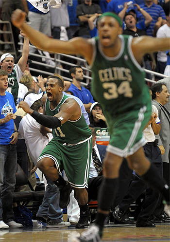 11일(한국시간) 미국 플로리다주 올랜도 암웨이 아레나에서 열린 2008-2009 미국프로농구(NBA) 4강 플레이오프(7전4선승제) 올랜도 매직과 4차전에서 버저와 함께 폴 피어스의 패스를 받은 데이비스가 슛을 던지고 승리하자 포효하고 있다.