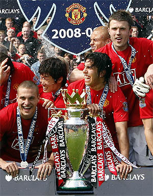 영국 멘체스터 울드 트래퍼드에서 열린 아스널과 2008-2009 프리미어리그 37라운드 홈 경기를 마치고 우승을 확정지은 맨체스터 유나이티드 선수들이 우승컵을 안고 환호하고 있다. (desk@jjan.kr)