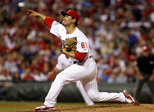 박찬호는 26일(한국시간) 펜실베이니아주 필라델피아의 시티즌스 뱅크 파크에서열린 미국프로야구 플로리다 말린스와 홈경기에서 3-4로 뒤진 7회초 선발 투수 제이미 모이어에 이어 등판해 3이닝 동안 안타 4개와 볼넷 1개를 허용하고 1점을 줬다.