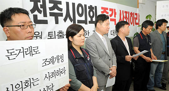 민생경제연구소와 공무원노조 전주시지부, 전북문함대, 전주시민회, 민노당 전주시위원회, 창조한국당 전북도당, 진보신당 전북도당 등 전주지역 7개 시민단체와 정당으로 구성된 '비리 공모 전주시의원 퇴출을 위한 전주시 대책위원회'는 3일 전주시청 브리핑룸에서 기자회견을 열어 "비리로 얼룩진 전주시의회는 시민들의 심판을 받아야 한다"고 경고했다.