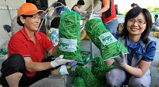지난 4일 서울소재 E마트에 입점한 순창 완두콩을 농민 등이 들어보이고 있다. (desk@jjan.kr)