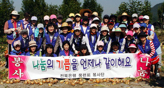 전북은행 여직원 모임인 '목련회' 회원과 가족 50여명은 13일 완주군 고산면 신상마을에서 농촌인구 감소와 고령화로 일손이 부족하여 양파 수확이 늦어져 어려움을 겪고 있는 농가를 찾아 양파 캐기 농촌 일손돕기 봉사활동을 실시하였다.