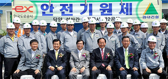 88고속도로 담양~성산간 확포장공사 제2공구와 관련해 현대건설 현장사무소에서 열린 안전기원제 참여자들이 포즈를 취하고 있다. (desk@jjan.kr)