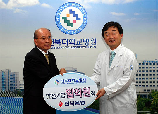 전북은행(은행장 홍성주)은 18일 지역발전을 위한 동반자로서의 역할 수행과 전북대학교병원의 발전을 위하여 발전기금 1억원을 김영곤 병원장에게 전달 하였다.