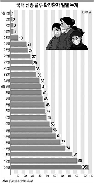 국내에서 50여일만에 감염환자 수가 100명을 넘어서면서 신종인플루엔자 확산추세에 대한 우려가 커지고 있다.