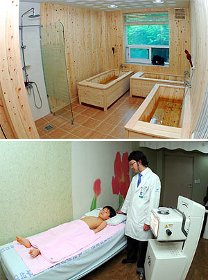 수치료실에서는 또 환자의 체질에 맞는 한방 입욕제를 활용한 목욕치료, 천연약제를 피부로 흡수하게 하면서 적절한 발한법에 따라 체내에 쌓인 독소를 제거하는 사우나 온열법도 병행된다.