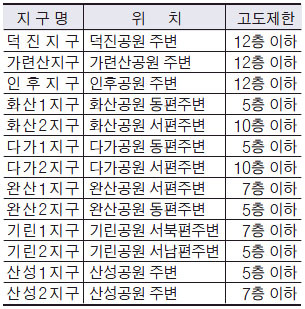 전주시는 고도완화 기준으로 우선 '시가화'를 제시했다. 이미 개발된 지역 즉 경관 보존에 대한 필요성이 떨어지는 구역부터 조정하겠다는 것. 이를 감안할 때 주변구역이 이미 다양하게 개발된 완산공원과 덕진공원, 가련산공원 주변구역의 완화방안이 거론된다. 이들 구역은 지난 2005년 대한국토·도시계획학회의 고도제한관련 용역결과에서 제시됐었다. 이 용역에서는 화산공원과 인후공원의 완화방안도 거론됐었다.