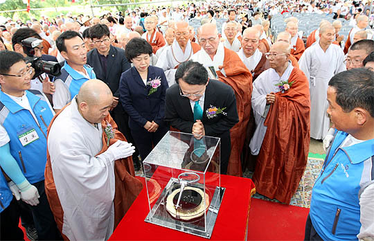김완주 도지사와 금산사 주지 원행스님이 미륵사지 석탑에서 수습된 부처님 사리를 친견하고 있다. 안봉주(bjahn@jjan.kr)