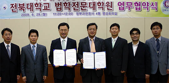 전북대 법학전문대학원(로스쿨)은 29일 오전 정부 과천청사 4동 영상회의실에서 법무부와 '나누는 법, 행복한 법'실현을 위한 법률교육 공동사업 추진 업무협약(MOU)을 체결했다. 업무협약식에는 신양균 전북대 법학전문대학원장과 소병철 법무부 범죄예방정책국장 등 양측 관계자들이 참석했다.