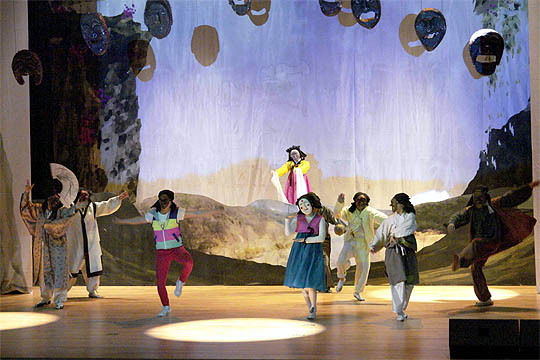 특히 이 공연에는 8개의 탈을 쓴 배우들과 '움직이는 인형극 틀'안의 줄 인형이 무대와 관객, 배우가 한 공간에서 서로 소통하며 무대와 객석의 경계를 넘나들며 자유로운 극의 형식을 만들어내고 있다.