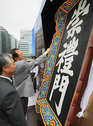 행사는 이건무 문화재청장과 민주당 국회 문방위 간사인 전병헌 의원 등이 참석한 가운데 진행됐으며, 현판 복원이 완료됐음을 전하는 의식인 고유제도 곁들여졌다.