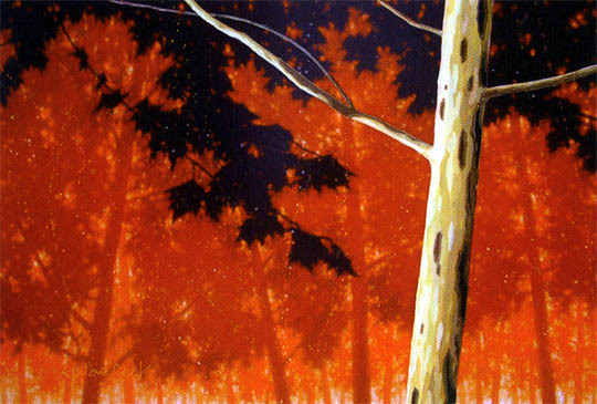 나무 길 사이 청량하게 잠들어 있는 숲, 노을 진 정적의 숲. 그 숲엔 길이 없다. 자연주의의 진부한 관행을 깬 주태석씨(홍익대 교수)는 작품 '자연 이미지'를 통해 숲(나무)만을 그려온 인물. 태양이 이글거리며 어둠을 깨울 때 일년 내내 진통했을 숲의 신비가 담겼다.