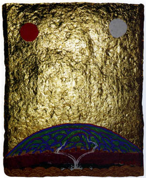 예원예술대 교수인 이철규씨는 '相生-合'을 통해 만물과 조화를 이루고픈 작가의 열망을 한지죽에 금박 채색 덧입혀 표현했다. 전통재료로만 그리는 구상작업부터 다양한 재료를 들여오는 실험작업까지 작업의 깊이와 폭을 다져간 작품의 연장선이다.