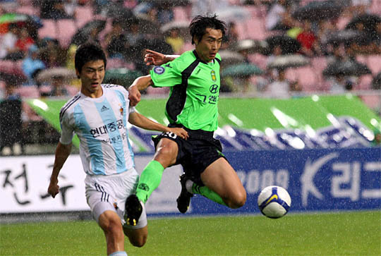 울산 이진호는 같은 팀 현영민이 전북 수비를 피해 연결한 공을 받아 동점골을 기록하며, 승부의 균형을 원점으로 돌렸다.