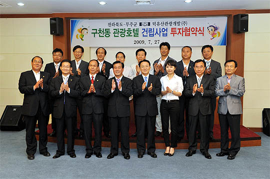 구천동관광호텔(가칭) 건립을 위한 투자 협약식이 27일 무주군청 대회의실에서 김완주 지사와 홍낙표 무주군수, 덕유산관광개발(주) 서연주 대표이 참석한 가운데 열렸다.