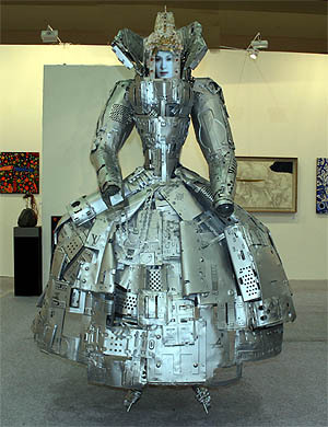 성능이 저하돼 버려지는 컴퓨터는 그야말로 골치덩어리 폐품이다. 그러나 그의 작업의 매력적인 바디라인은 이 폐품에서 나온 컴퓨터 바디로 구성돼 있다. 컴퓨터 바디의 재료를 두드리고 조립해 신화 속 인물을 형상화하고 거기에 영상을 더해 생명을 부여하는 리우의 작품 '엘리자베스 1세'. 릴케의 말에서 모티브를 따온 심소영의 설치작품 '그림자를 서로 보다'나, 천 위에 먹물로 그린 엄소영의 '날개'에서도 새로운 기운이 느껴진다.