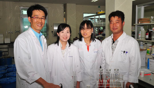 순창 장류연구소에서 고추장에 대한 연구개발을 하고 있는 전북대학교 식품공학과 순창분원의 연구실습생인 박해석, 다나까미까, 이미연, 위우창씨(사진 왼쪽부터). (desk@jjan.kr)