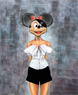 다음은 서양화. 서완호씨는 억압되고 왜곡된 현대사회를 살아가는 사람들의 숨겨진 본능, 공허감에 주목했다. '무제'에선 미키마우스 가면을 쓴, 얼굴 표정을 가린 여인이 등장한다. 사회로부터 강요당하는 여성의 굴레가 목의 족쇄로 표현됐다. 회색 실루엣은 눈에 보이는 존재의 허망함을 드러낸다.
