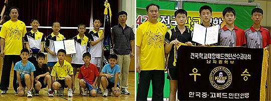 군산 나운초등학교(사진 왼쪽)와 군산 금강중학교 배드민턴부가 지난달 24일부터 30일까지 경남 밀양에서 열린 '제42회 전국학교대항배드민턴선수권대회'에서 각각 초등부와 중등부 단체전에서 우승했다. (desk@jjan.kr)
