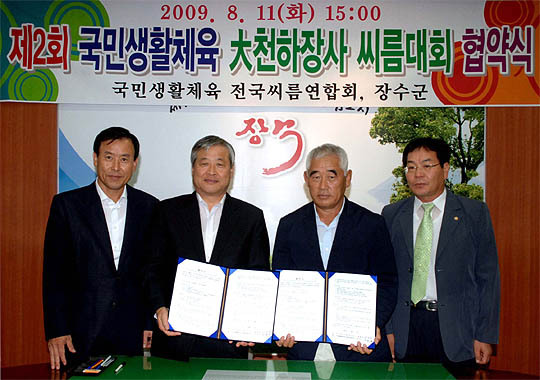 장수군은 '제2회 국민생활체육 대천하장사씨름대회'의 성공 개최를 위해 11일 장재영 군수를 비롯해 황경수 전국씨름연합회 부회장, 홍양의 전북씨름연합회 회장, 씨름관계자 등 20여명이 참석한 가운데 국민생활체육전국씨름연합회와 협약식을 가졌다.