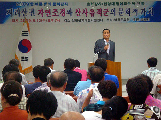 12일 오후 7시 남원문화원 문화예술지원센터 대강당에서 열린 '2009 한여름밤의 문화가족 포럼'에서 유인학 세계거석문화협회 총재는 "서남대륙권 자연환경과 생태자원의 보고이며 국립공원 제1호인 지리산의 천연 자연조경과 사찰군을 세계유산으로 등재하는 것은 춘향과 국악의 고장 남원에 더 큰 자랑거리를 만드는 것"이라며 "남원시민들의 관심이 절실히 요구된다"고 주장했다.