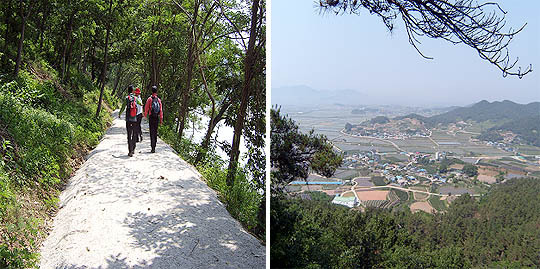 (왼쪽) 등산객들이 신화가 있는 질마재길을 걷고 있다. (오른쪽) 신화가 있는 질마재길 정상에서 바라본 고창 안현마을 전경. (desk@jjan.kr)