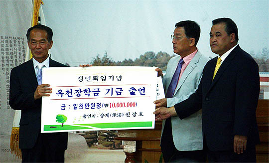 순창고등학교 신장호 교장이 지난 25일 정년 퇴임 축하연 자리에서 장학금 1000만원을 이 학교 재단인 옥천학원 류종선 이사장에게 전달한 것으로 알려져 주위를 훈훈하게 하고 있다.